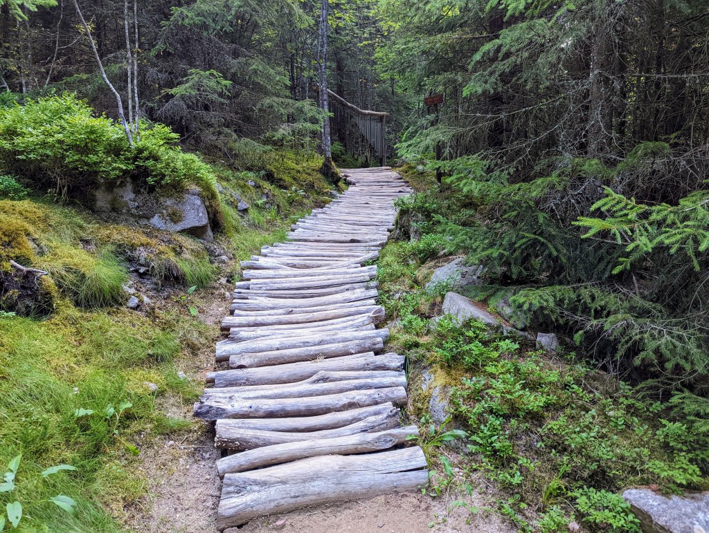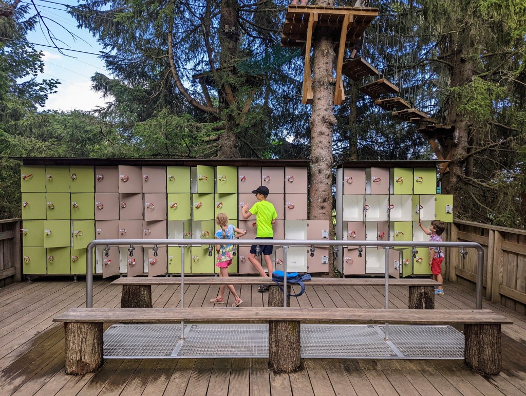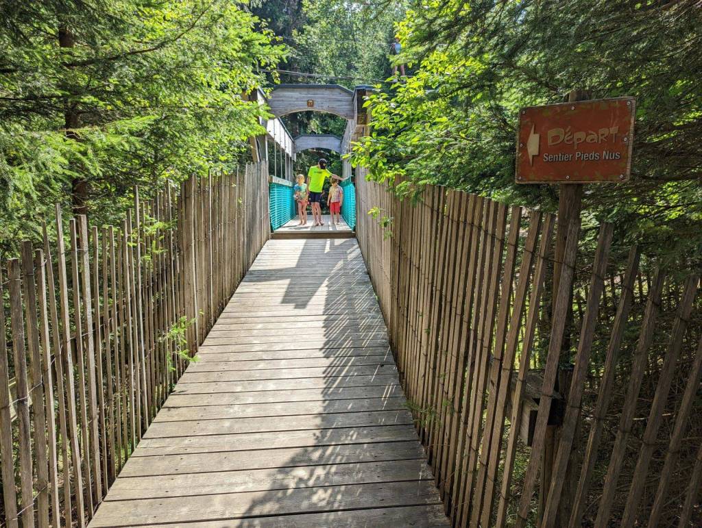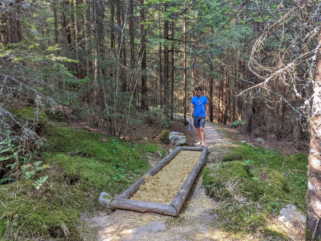 Location of the barefoot trail below is great as you can do at least 5(!) things: mountain biking, summer Alpine sledding, rope park, hiking Lac Blanc, and exploring barefoot trail, posted below: