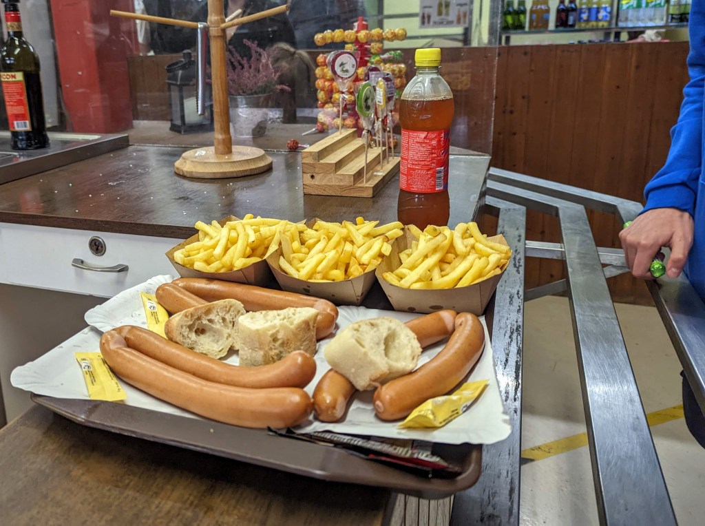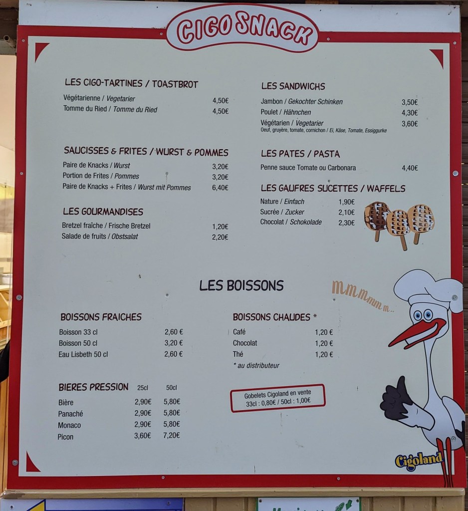 Menu for the day at Cigoland: beer, waffles, pasta, ice cream, knacks and fries: