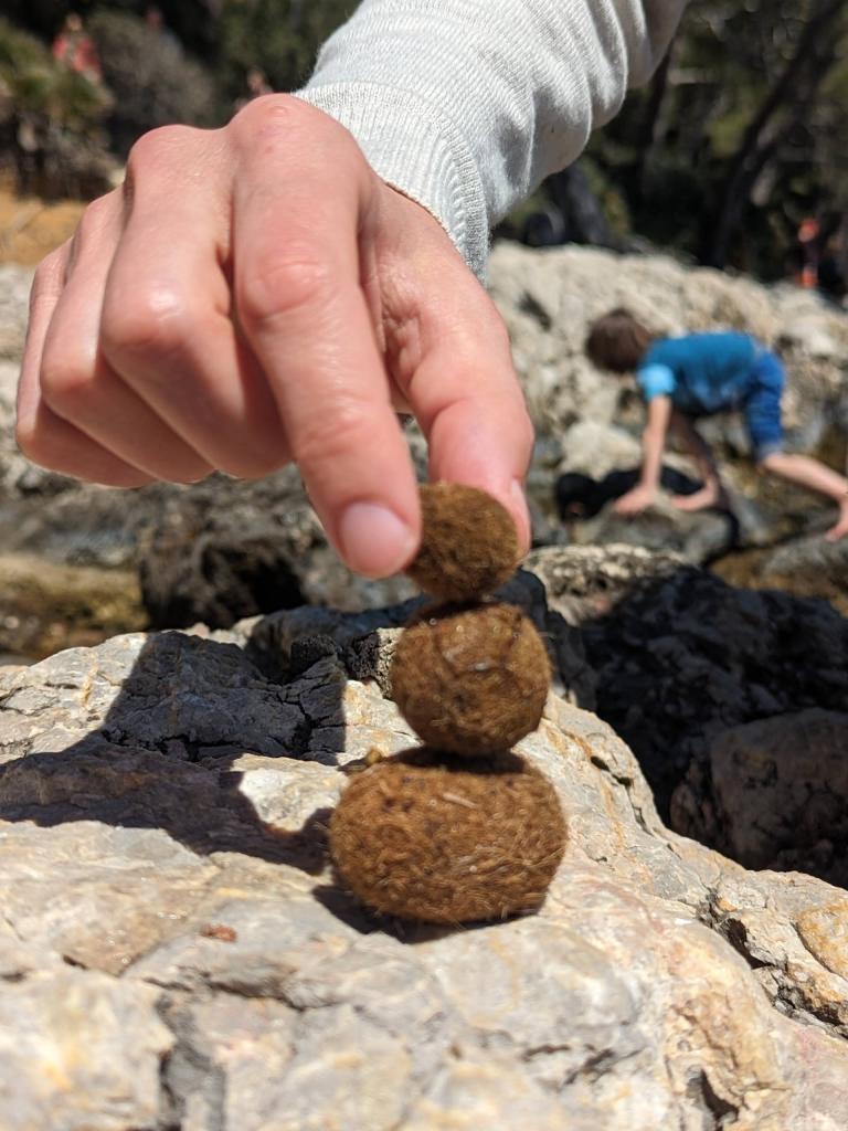 Large, round clumps of seagrass (posidonia oceanica) found on many of Mallorca’s beaches. When we first encountered it we wasn’t sure is it.. alive, is it a nut or a nest:
