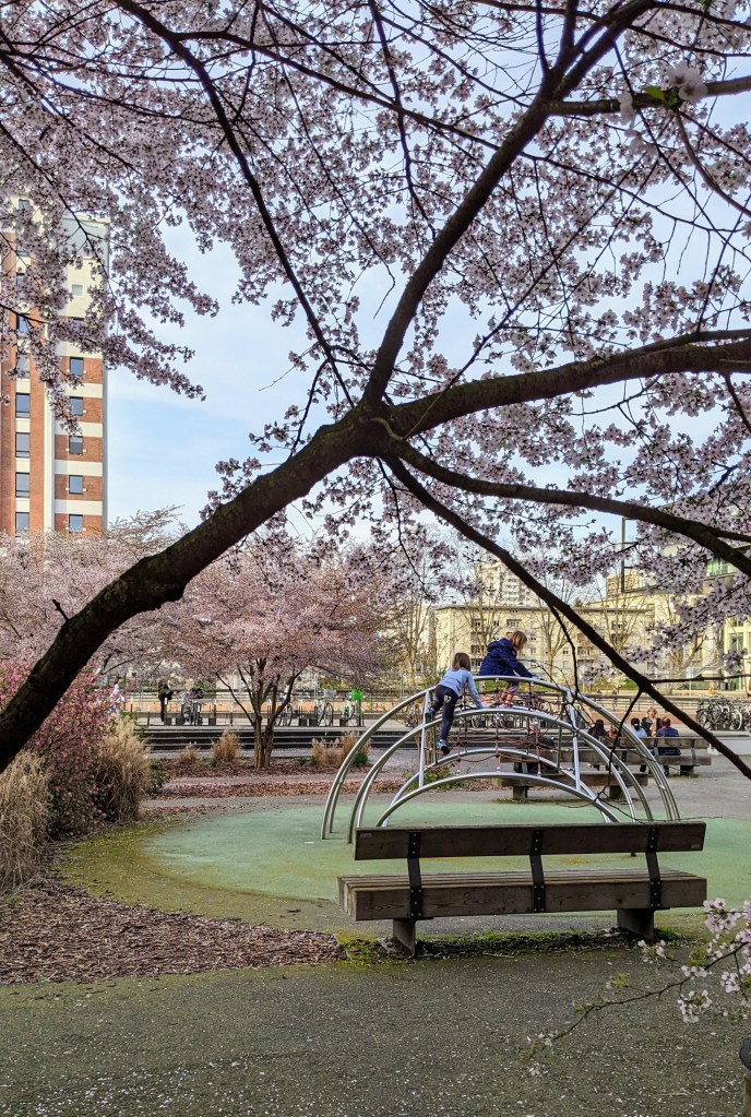 Nice, calm square, with a small playground, sand pit, and amazing cherry blossom: