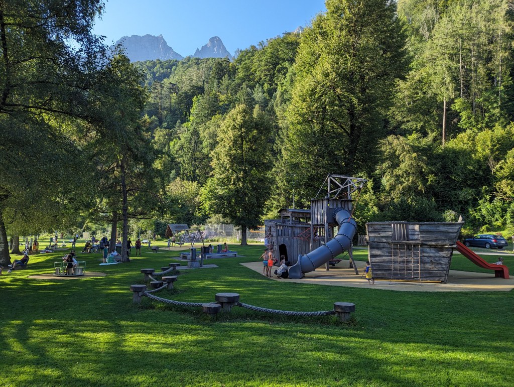 Lungern, a small swiss village, is home to Lake Lungern, a serene mountain lake perfect for spending a day with a family and kids. It has a beach, park, cafe, rentals, and slides: